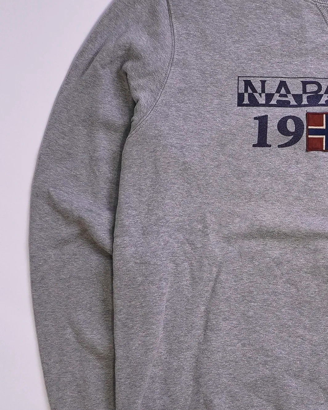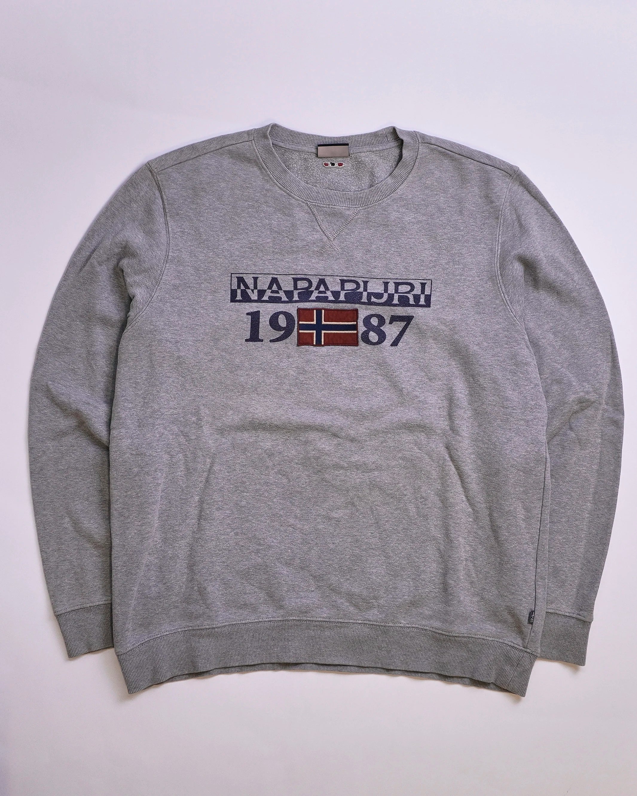 Product details: Gray crewneck sweatshirt with large front print "NAPAPIJRI 1987" and Norwegian flag graphic, ribbed cuffs and hem.