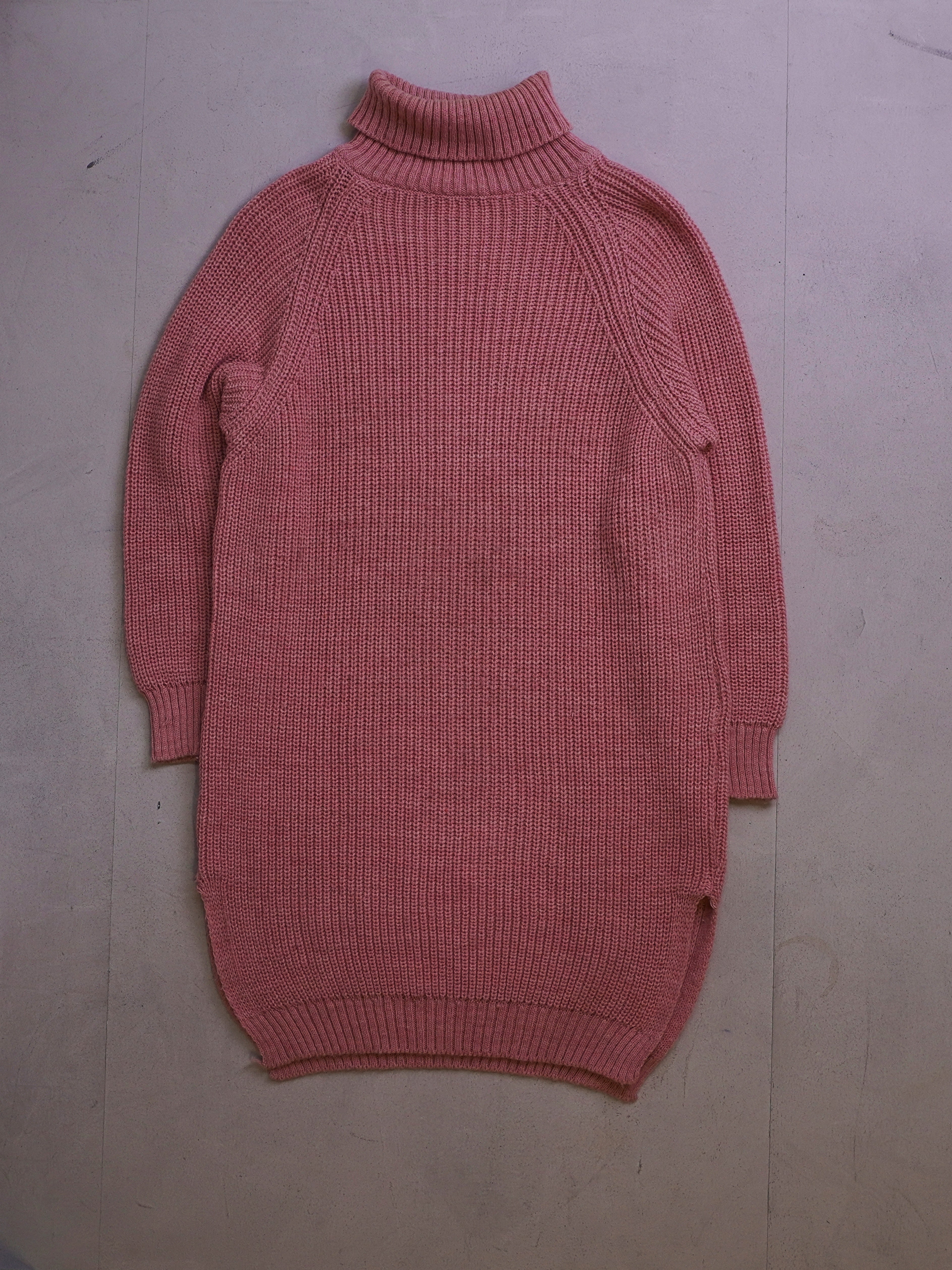 Product details: Chunky knit turtleneck sweater in dusty rose/pink with ribbed roll neck, ribbed cuffs and hem, and raglan-style shoulder construction; longline/oversized silhouette with a slight step hem.